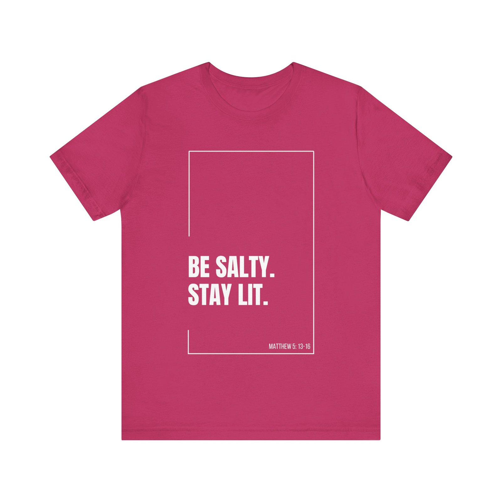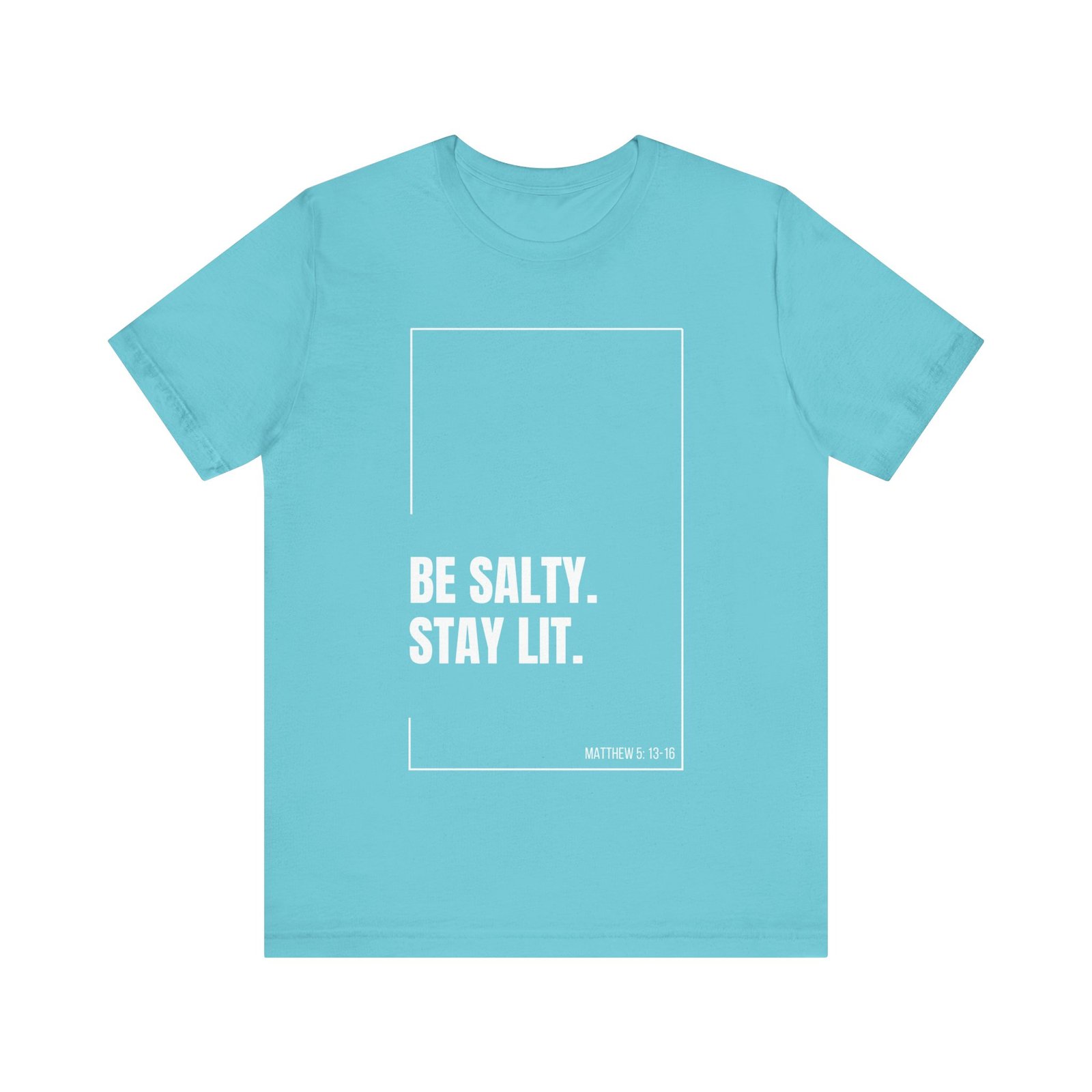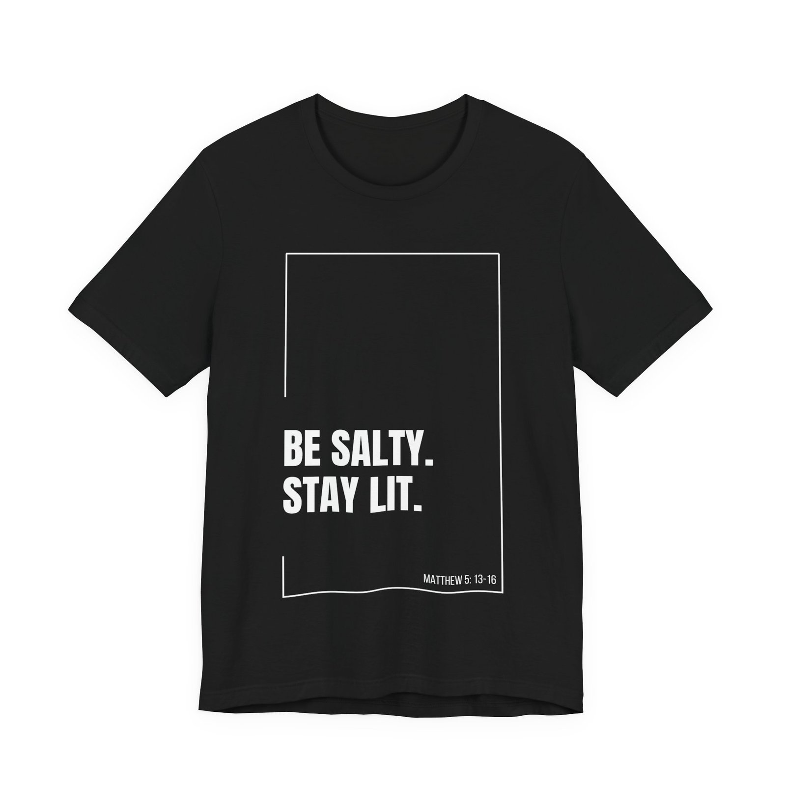 Shine bright and live boldly with this “Be Salty. Stay Lit.” Christian tee! Featuring "Matthew 5:13-16" printed on the design, this shirt is a creative take on Jesus’ words: “You are the salt of the earth… You are the light of the world.”