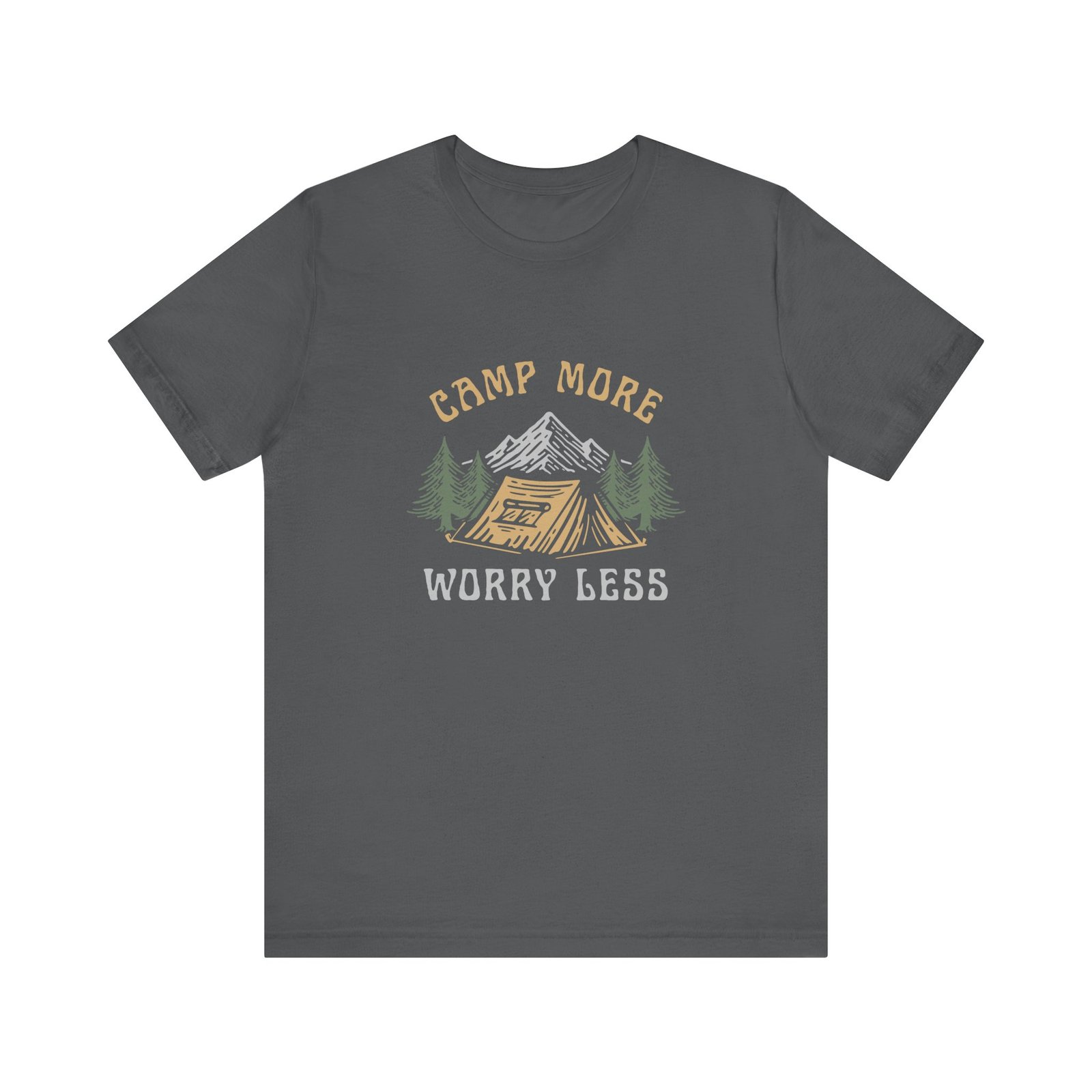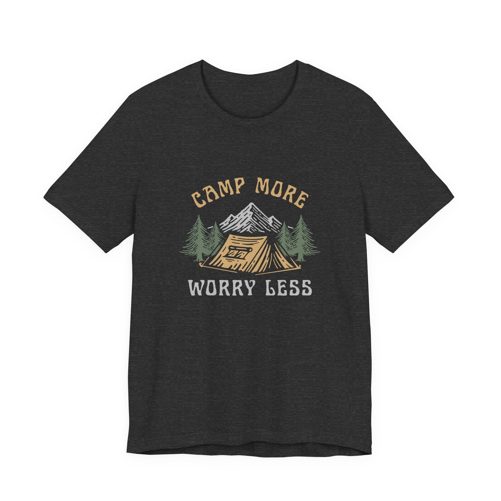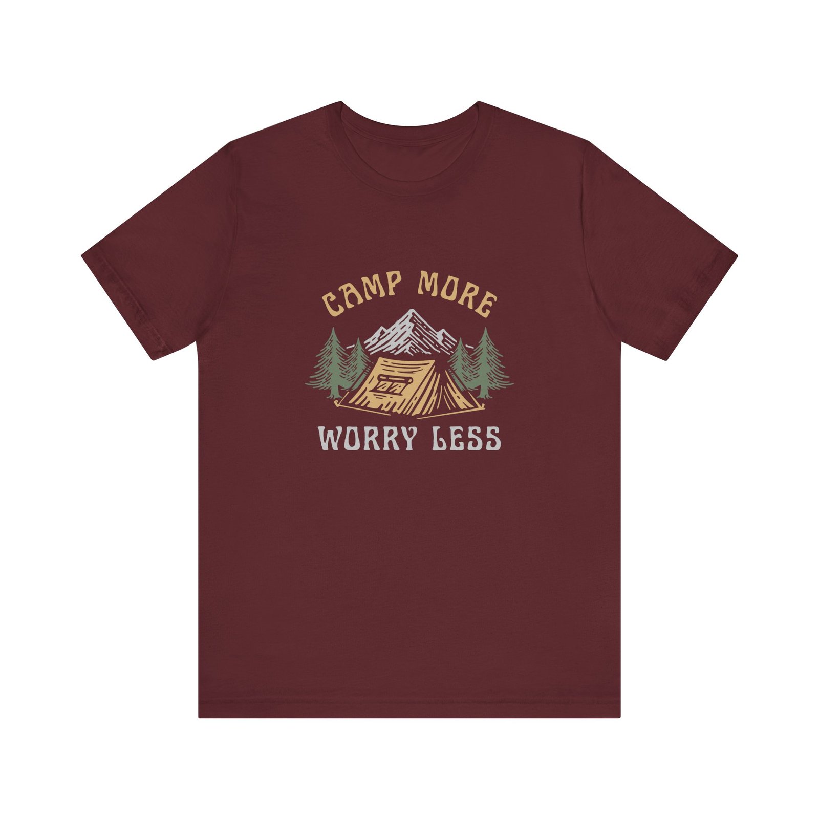 - “Camp More, Worry Less” design with tent, trees, and mountains