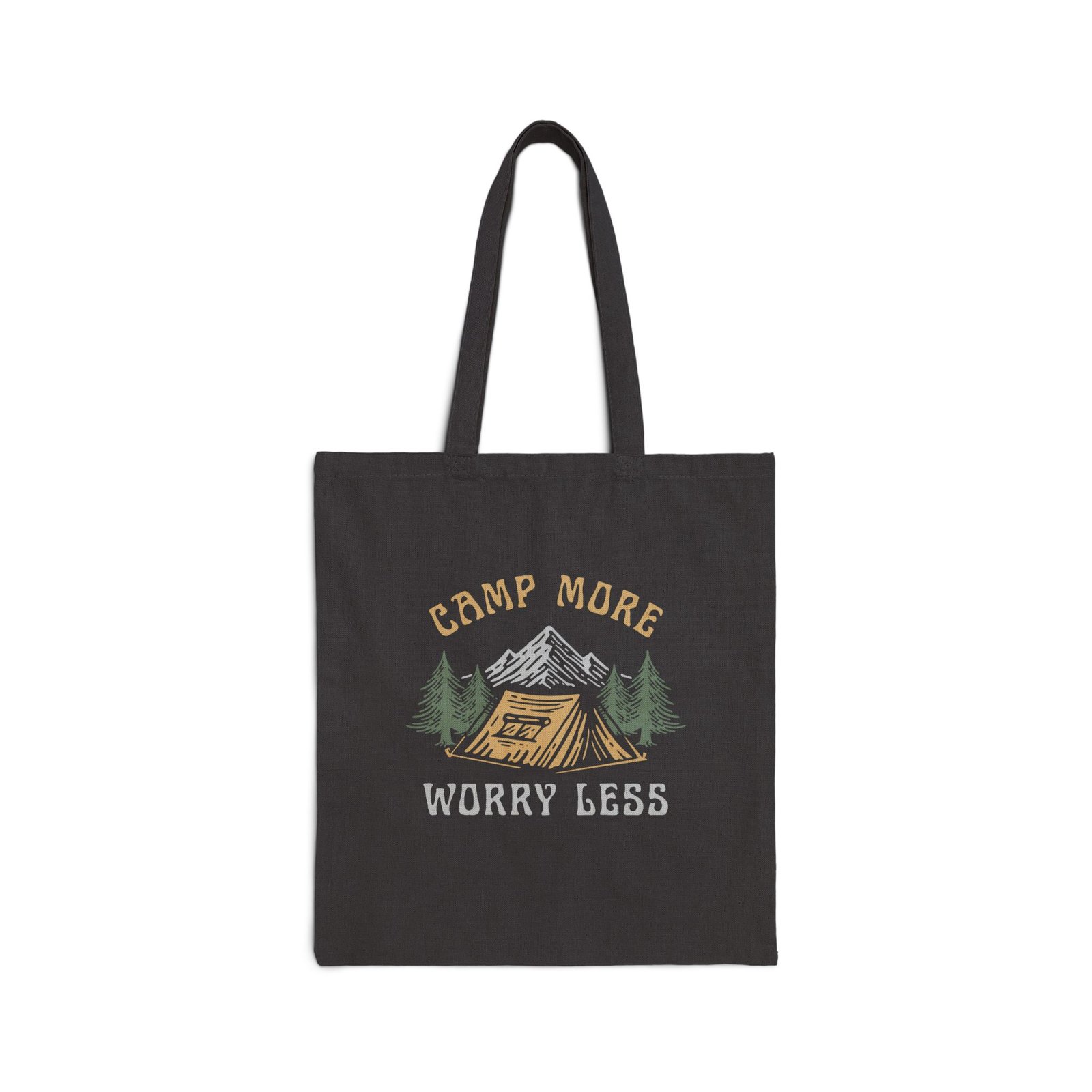 Camp More Worry Less Tote Bag – Black Canvas Camping Tote, Adventure Outdoor Bag with Mountains, Trees & Tent Design (15×16 in)
