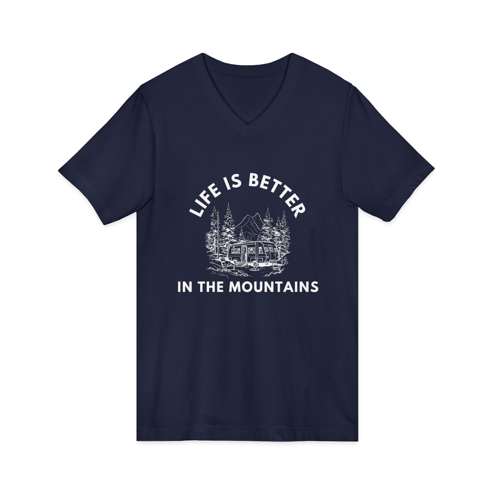 Life is Better in the Mountains Shirt – Bella Canvas Unisex V-Neck T-Shirt, RV Camping Graphic Tee, Adventure Nature Lover Gift