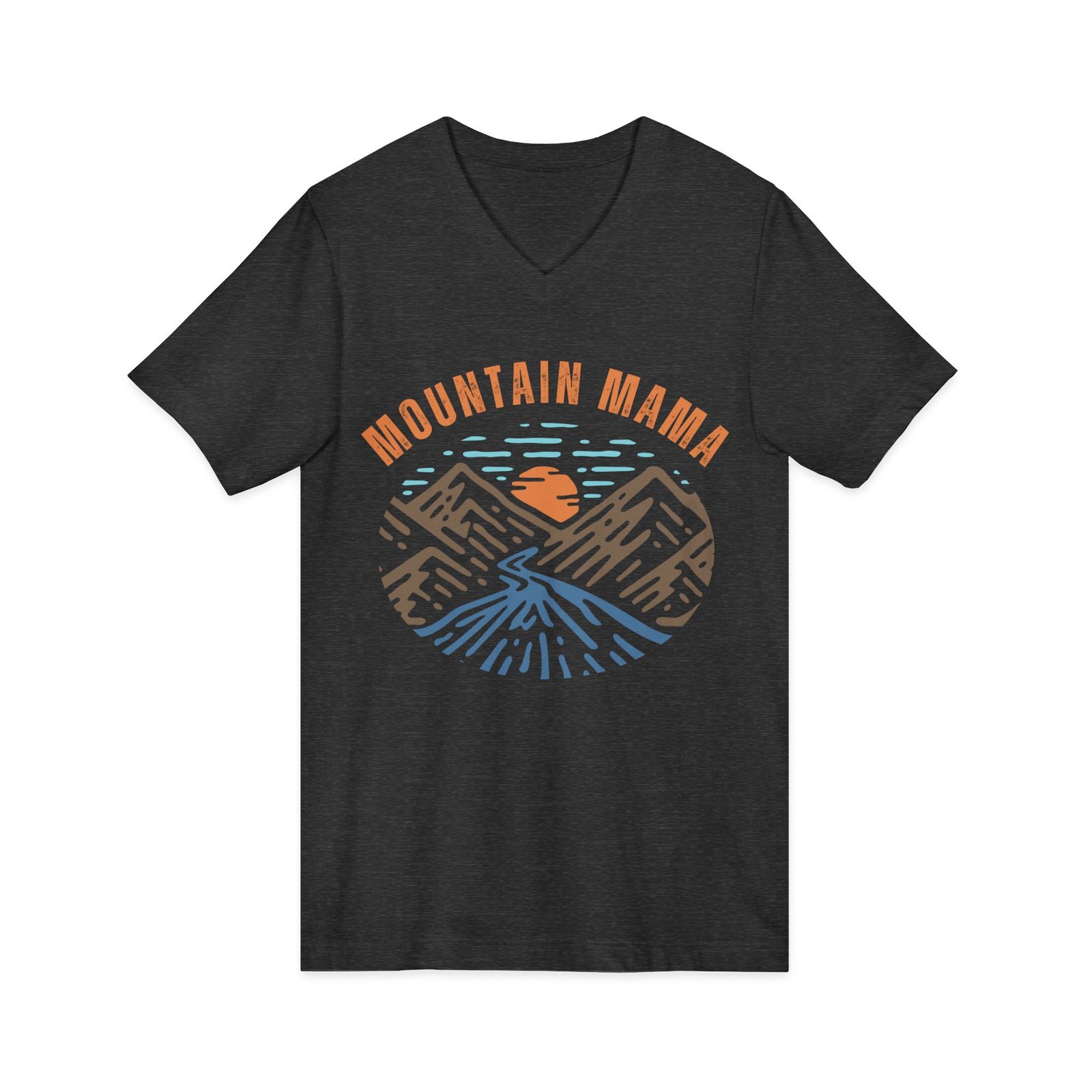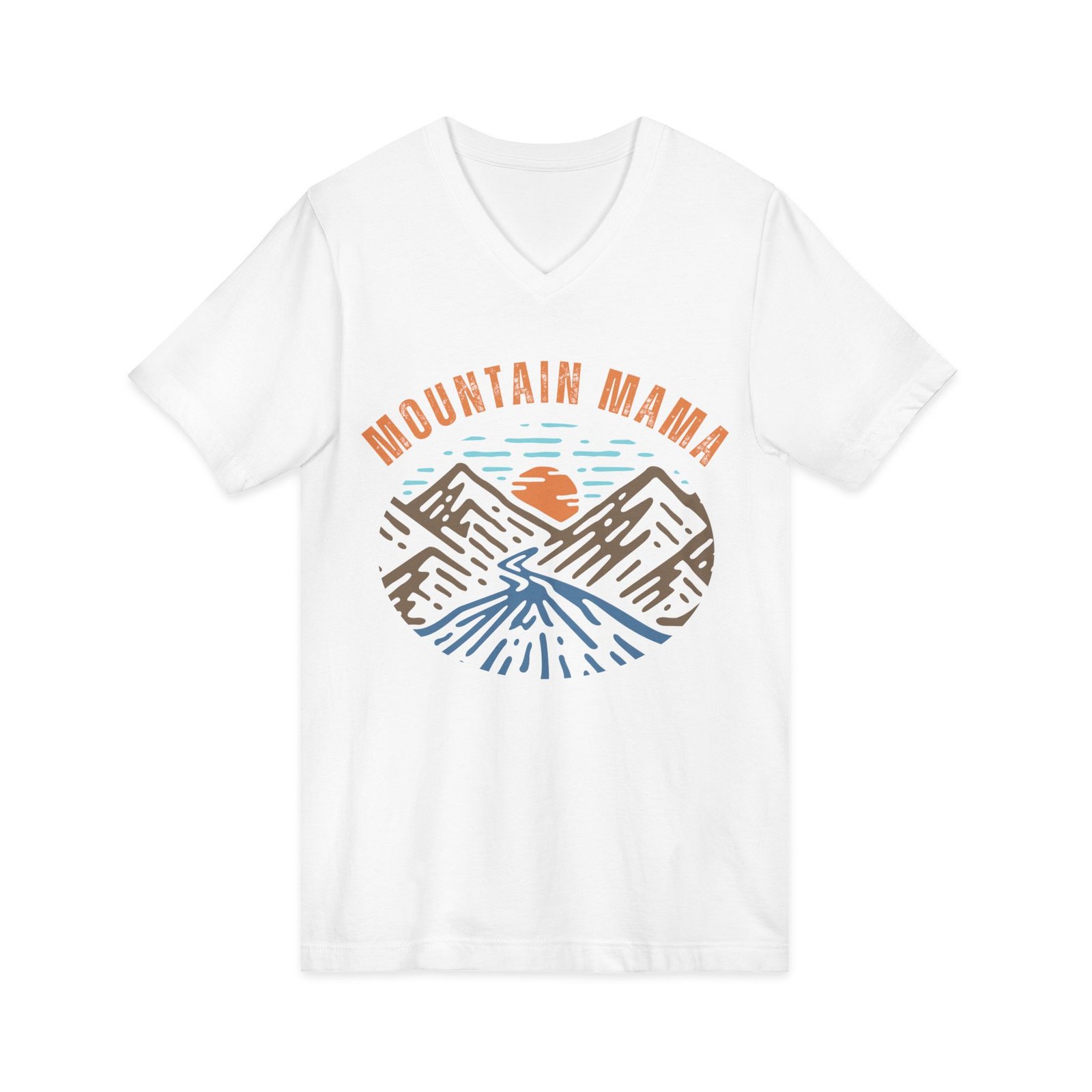Mountain Mama Shirt – Bella Canvas Unisex V-Neck T-Shirt with Mountains, Stream & Sun Graphic, Outdoorsy Adventure Tee