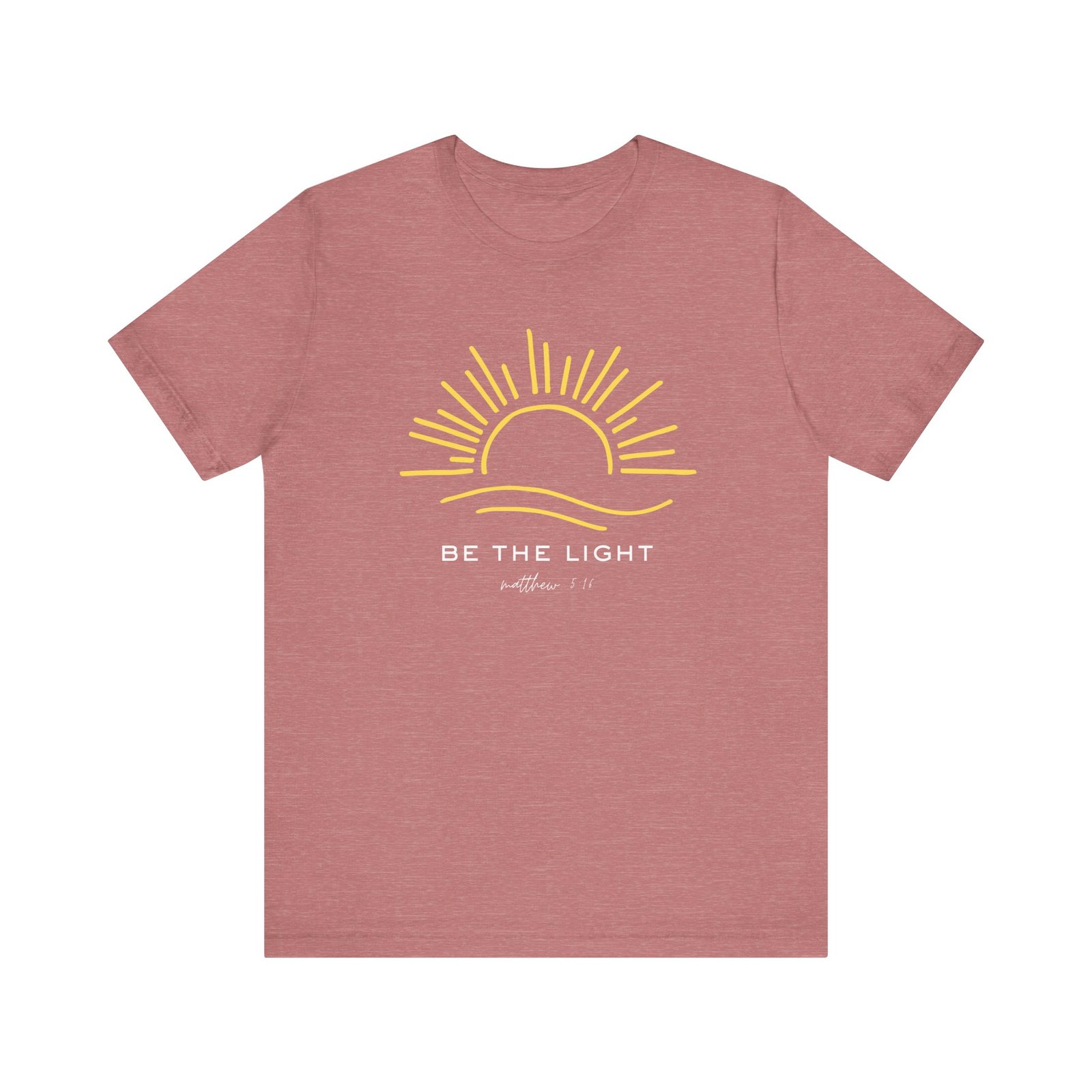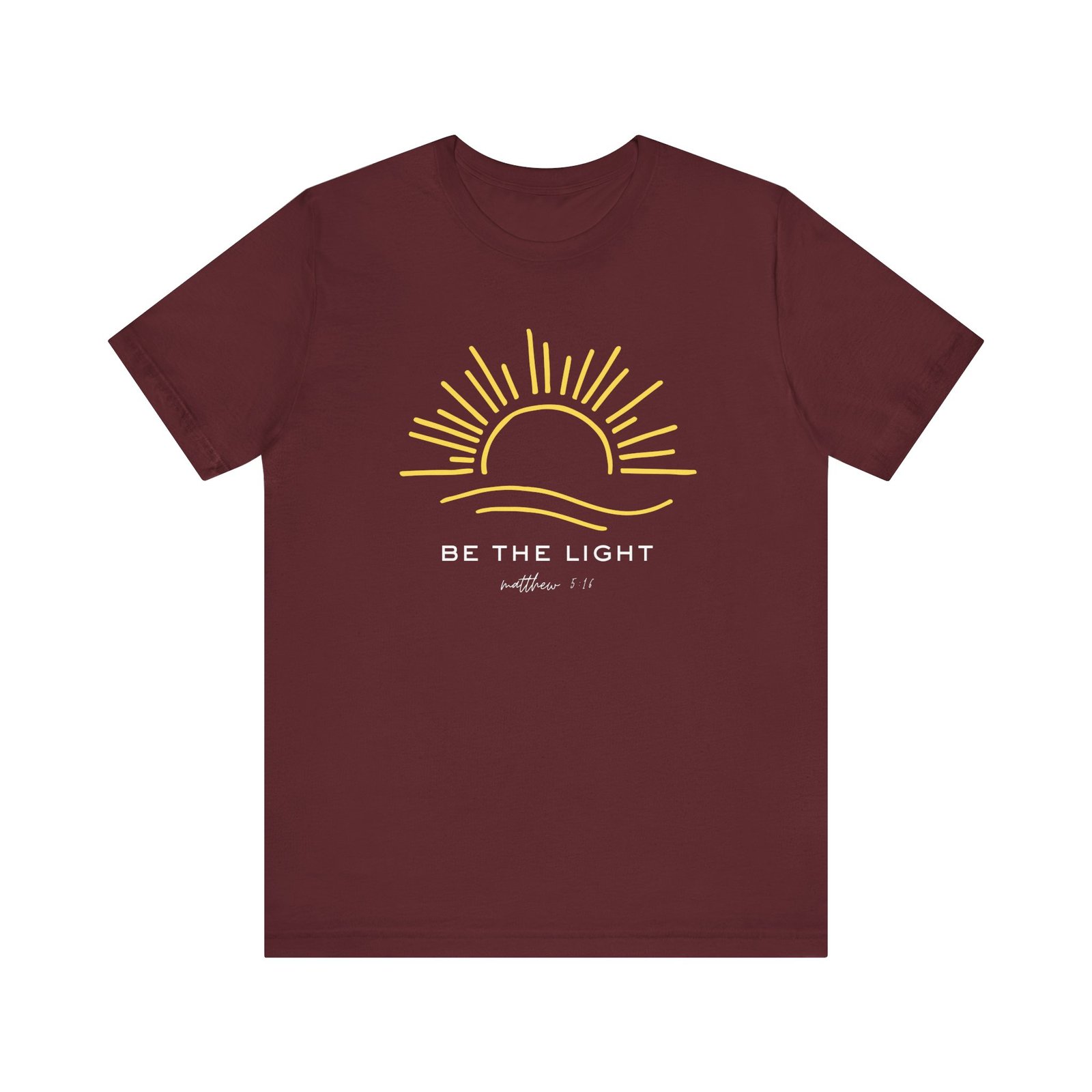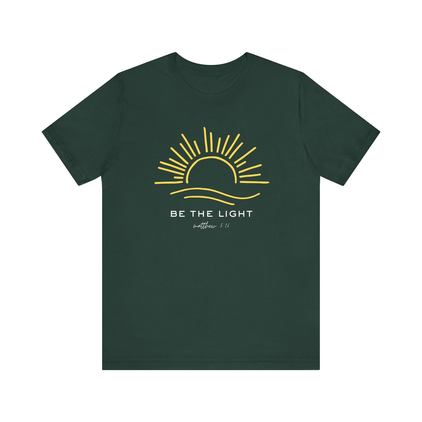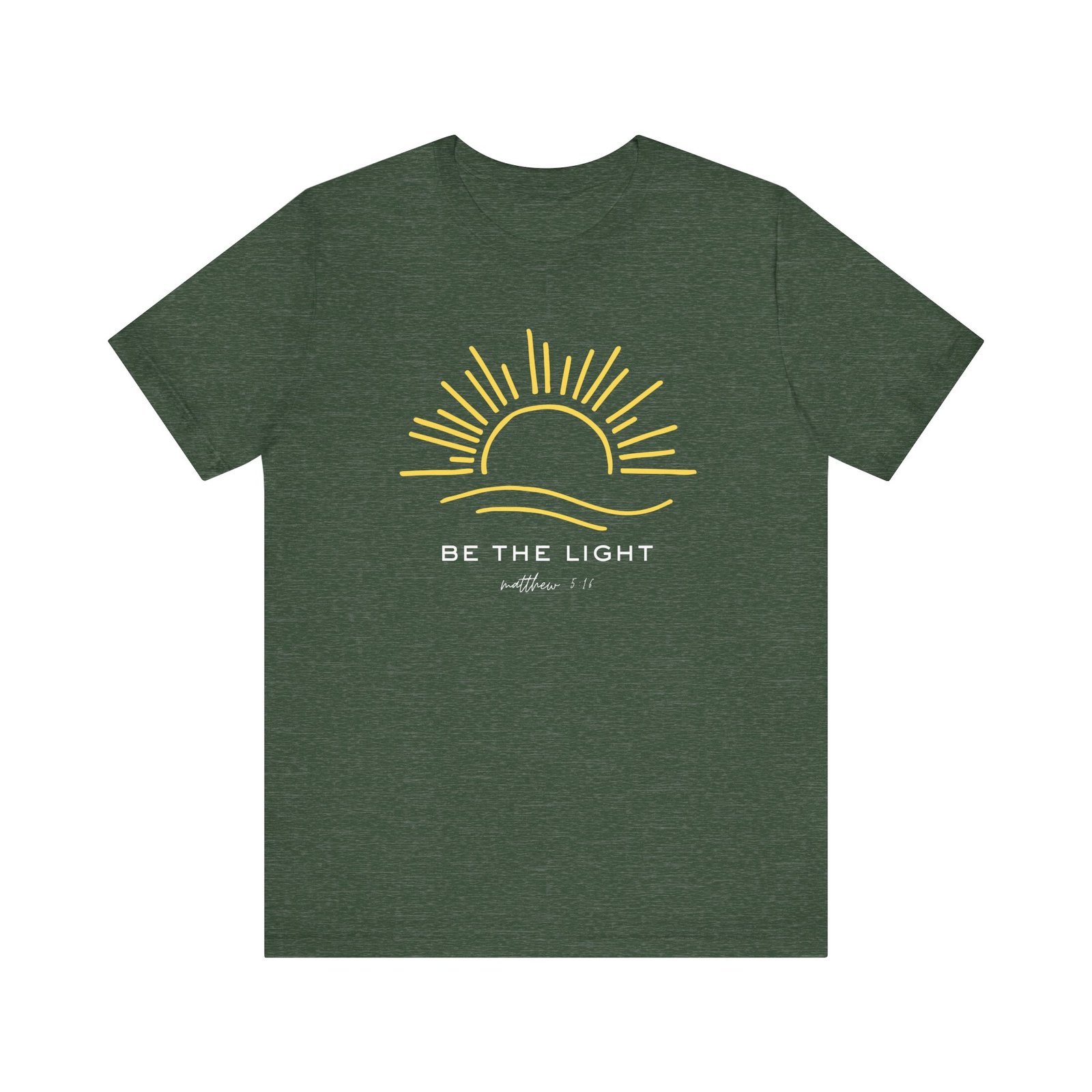 Shine your light wherever you go with this inspiring “Be the Light” t-shirt, featuring Matthew 5:16: